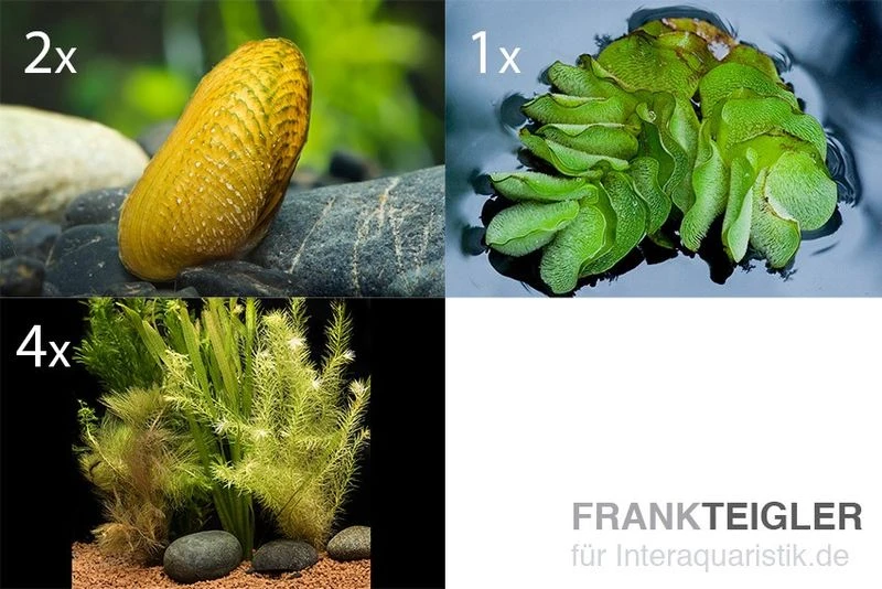 Diese natürlichen Helferlein, bestehend aus Ornamentmuscheln und verschiedenen schnellwachsenden Pflanzen, werden gründlich für klare Sicht in Ihrem Aquarium sorgen. Diese Anzahl Tiere & Pflanzen ist geeignet für ein Aquarium ab 60 Liter. Die Stängelpflanzen, die wir je nach Verfügbarkeit zusammenstellen, sind sehr schnellwüchsig und ziehen dadurch viele überschüssige Nährstoffe aus dem Wasser.